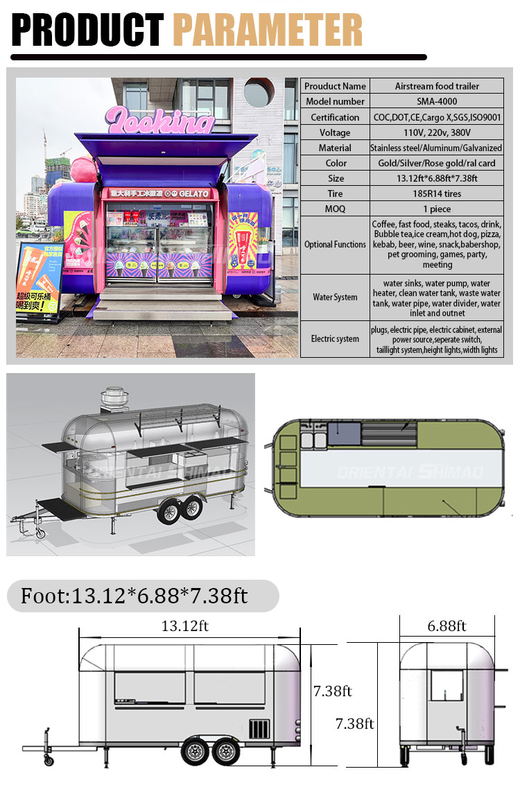 Golden stainless steel: the exterior of the food truck is made of high quality golden stainless steel. This material not only has excellent corrosion and abrasion resistance, but also the golden appearance increases the visual beauty and high-grade feeling, so that the food truck can stand out in various environments.