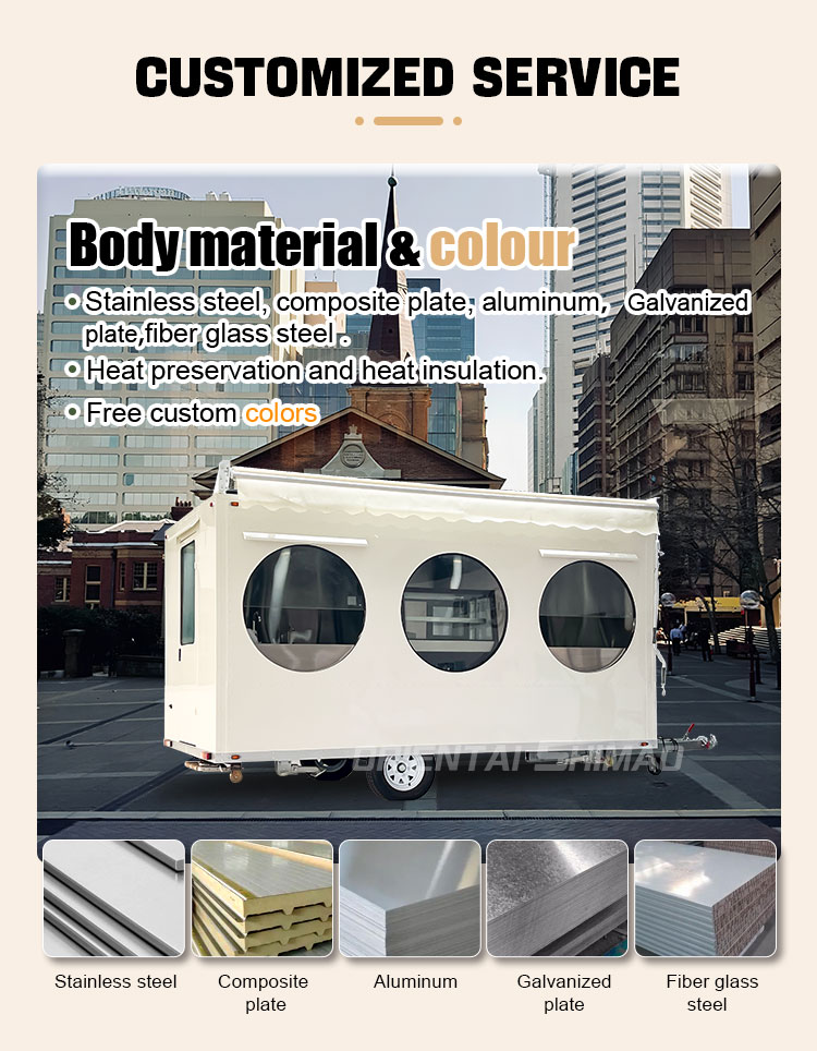 Golden stainless steel: the exterior of the food truck is made of high quality golden stainless steel. This material not only has excellent corrosion and abrasion resistance, but also the golden appearance increases the visual beauty and high-grade feeling, so that the food truck can stand out in various environments.