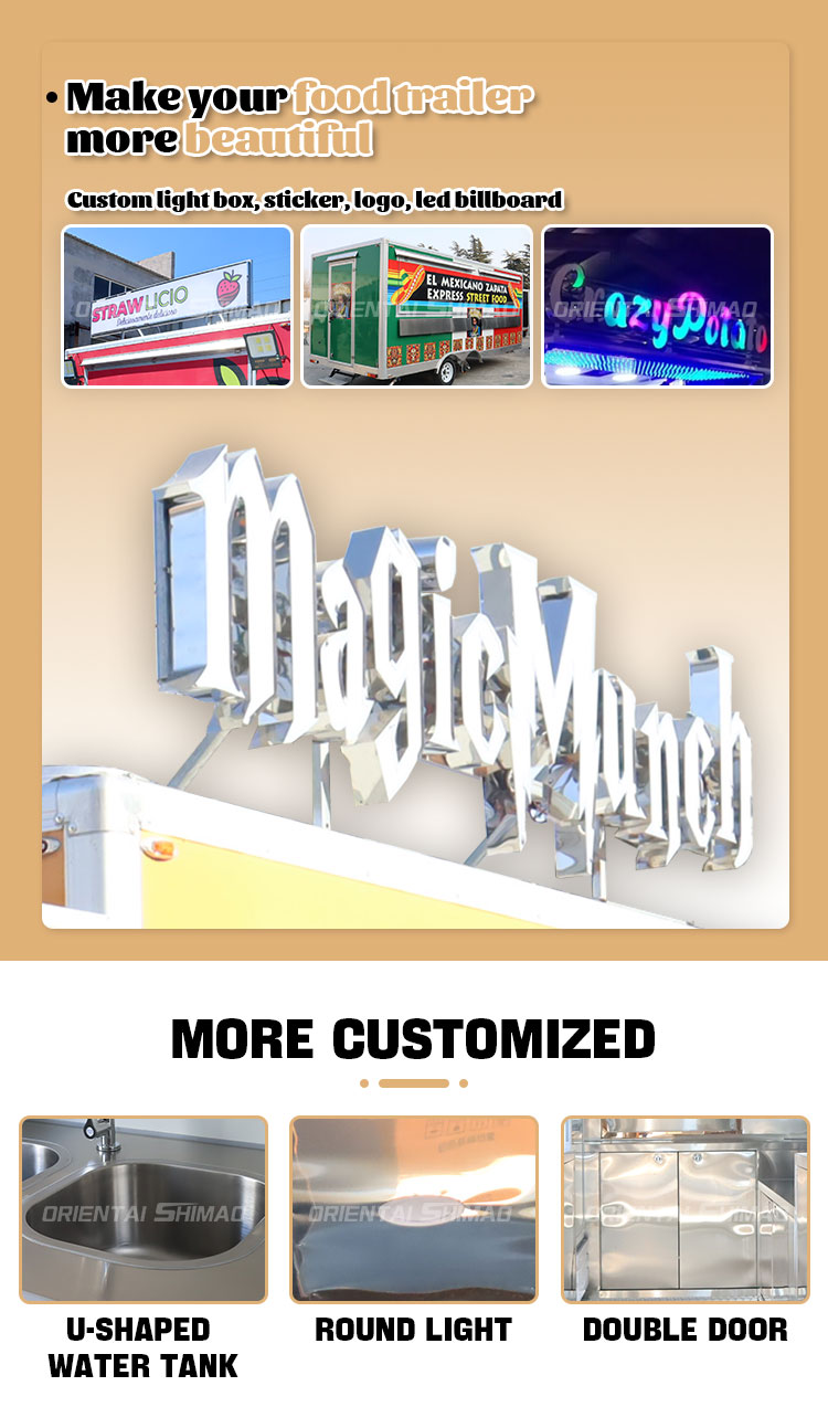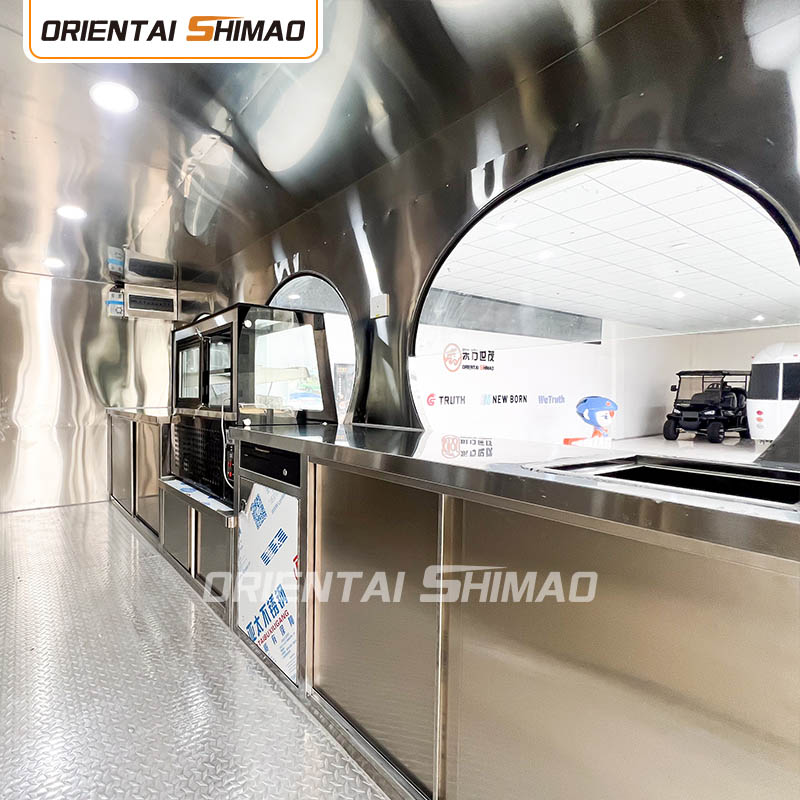 Golden stainless steel: the exterior of the food truck is made of high quality golden stainless steel. This material not only has excellent corrosion and abrasion resistance, but also the golden appearance increases the visual beauty and high-grade feeling, so that the food truck can stand out in various environments.