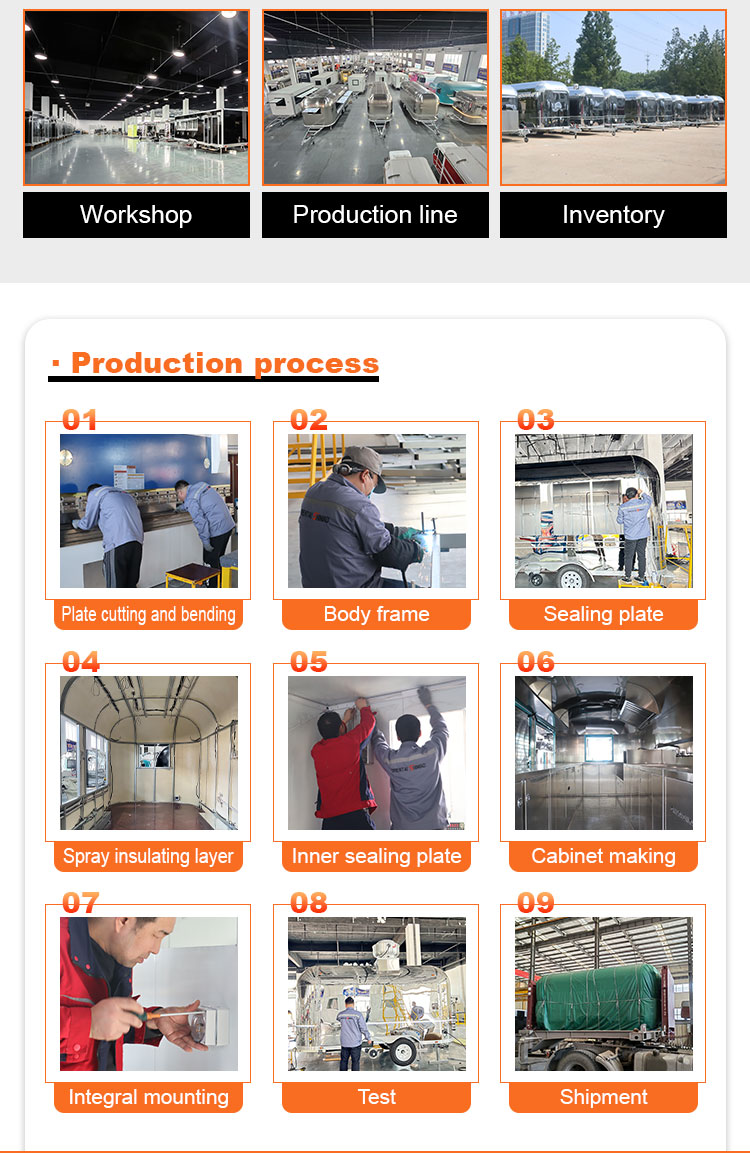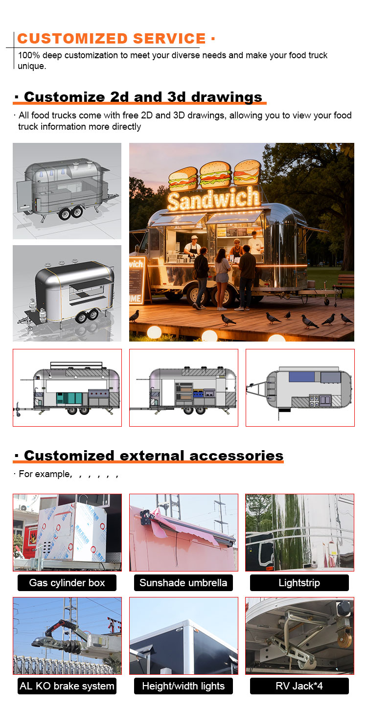 For the main material, we chose high-quality 304 stainless steel, which is known for its excellent corrosion resistance and excellent durability, and can maintain stable performance in a variety of environmental conditions, ensuring that our Trailer Food Truck products can maintain their excellent quality and functionality even in the long term and face a variety of challenges. 304 stainless steel's excellent resistance to corrosion, so that the Truck is not easy to be affected by oxidation or rust, which greatly extends its service life. The excellent corrosion resistance of 304 stainless steel makes the Truck less susceptible to oxidation or rust, greatly extending their service life.