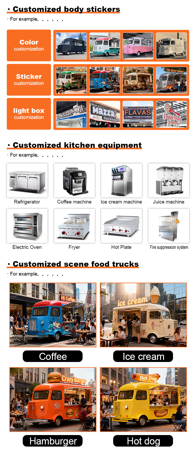Modelling and style: the appearance modelling and style of the food truck is an important factor to attract customers. It can be customised according to customers' brand image, business characteristics or personal preferences, such as streamlined design, retro style, modern simplicity and so on.